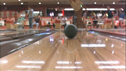 In sottofondo, il rumore del rotolare della palla da bowling, l’impatto, i birilli che cadono. E via di nuovo.